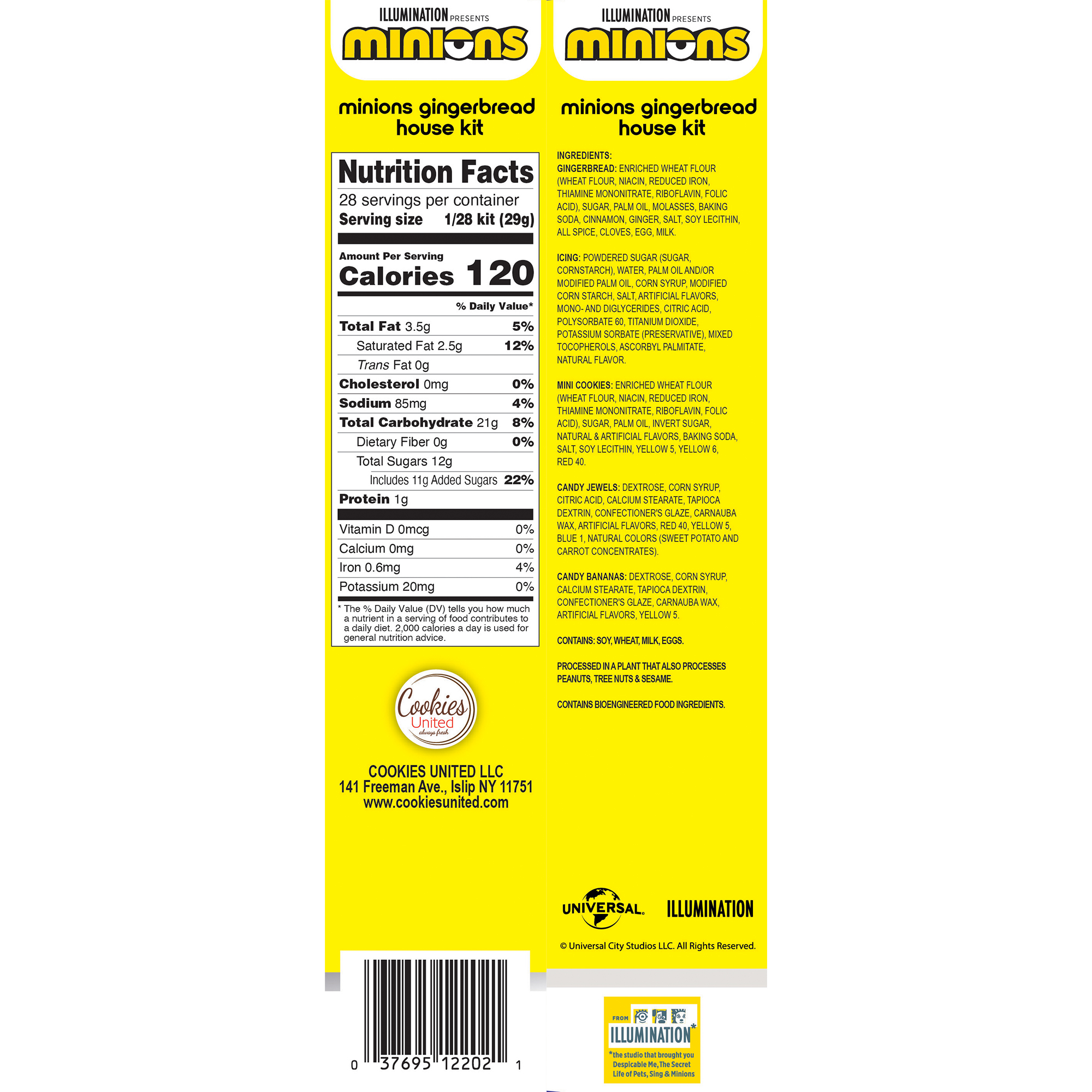 Families will go bananas over this Minion gingerbread house! It includes pre-baked gingerbread, pre-made icing, candy, scene setters, a simple start tray for easy building and mini cookie characters to make a despicably fun house! Item# 16202